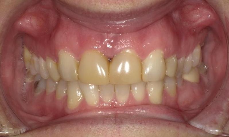 This patient came to us because the front teeth are very yellow and patient does not like them. The front teeth had old bonding done 25 years ago. They lasted a long time but over the years they developed stains internally due to the old porous bonding materials. Since we are unable to make them whiter with whitening, we have to remove the existing bonding and come up with new ways to make them look better.