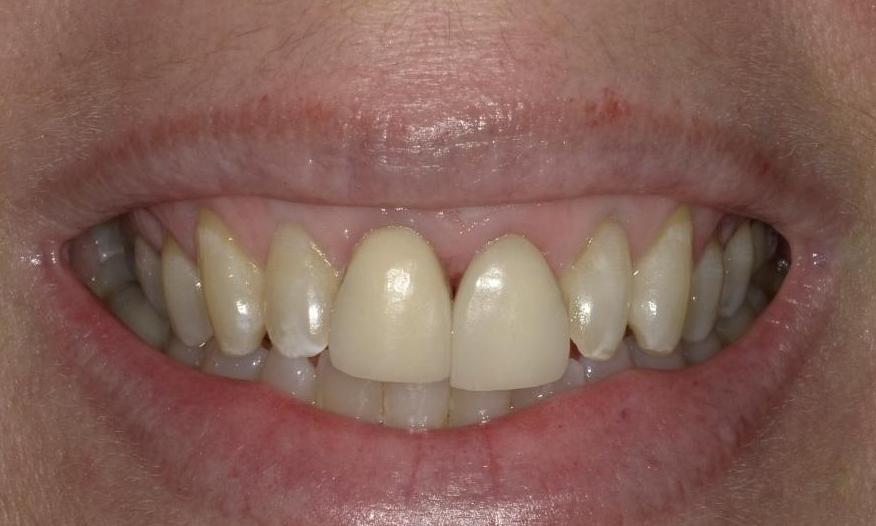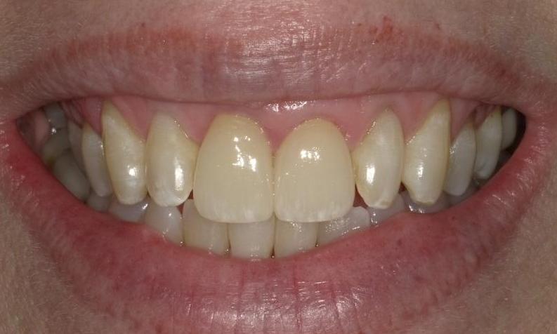 This patient has been coming to our office for years and she informed us recently she does not like her front crowns, hoping to replace them. There were also various structural issues with the crowns that can't be seen on the photos. We agreed it's time to replace them. Through the help of our labs, we were able to use a more esthetic crown material and customized some white staining to create a very close match to her adjacent teeth. Patient was very happy with the results and we're happy to have helped this patient improve her smile.